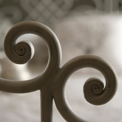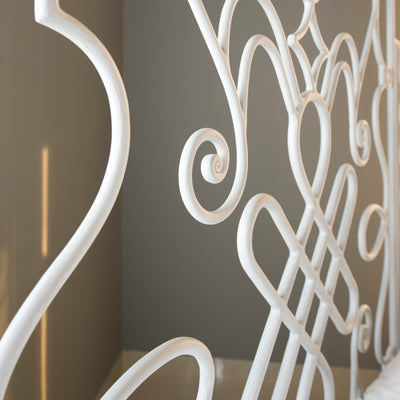 Close up of decorative wrought iron headboard with curves and scrolls in a white painted finish