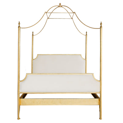 A refined canopy bed with gold leaf finish and upholstered panels—designed to frame the room with quiet grandeur.