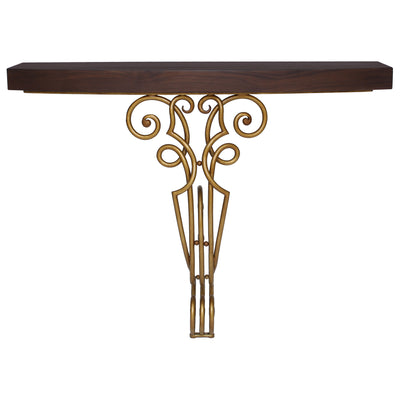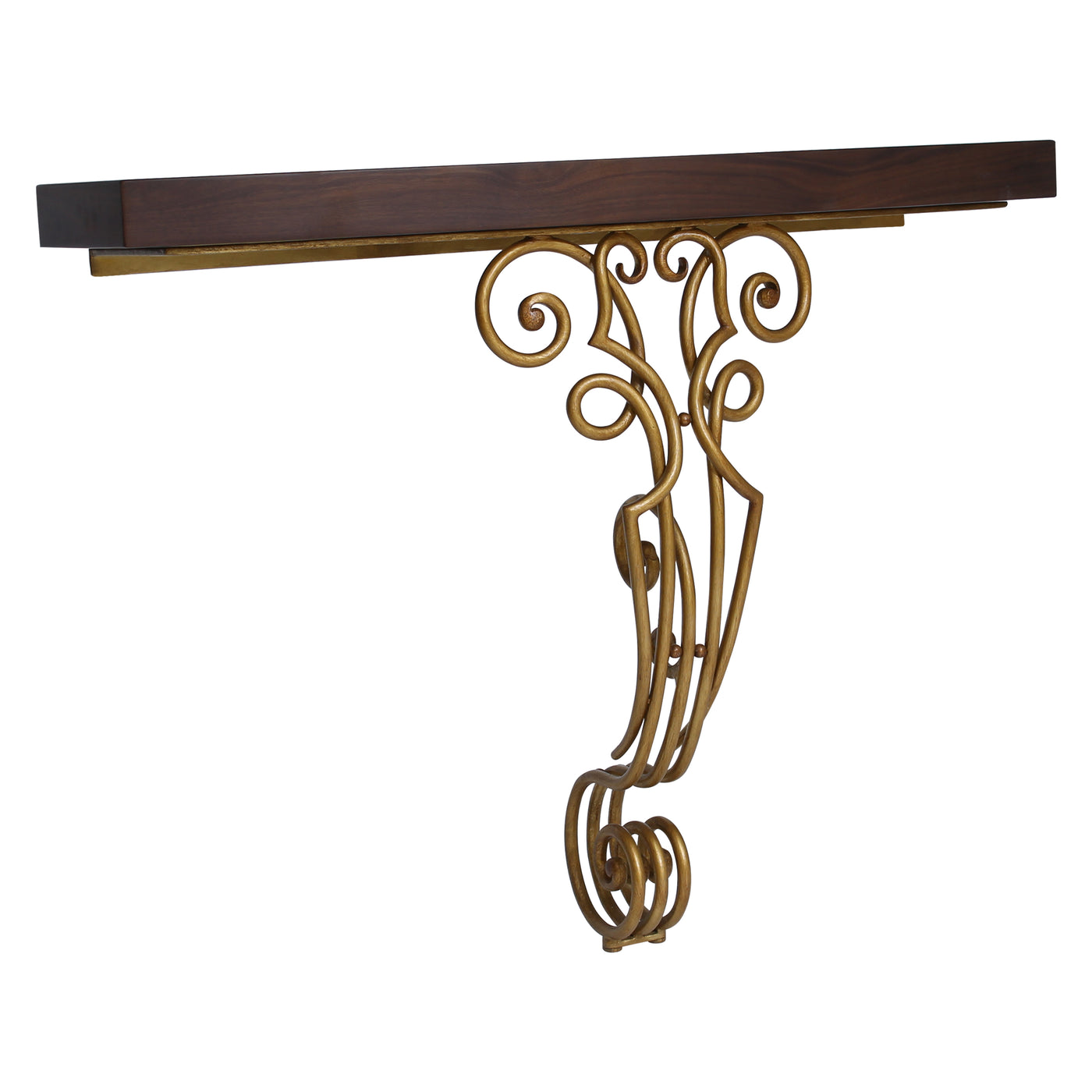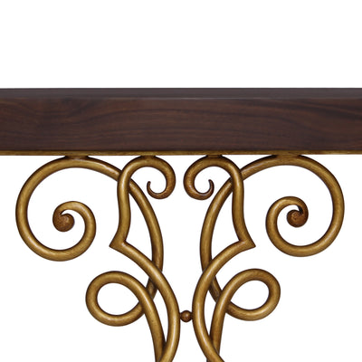 Close up of a bronze colored classical console with a wrought iron base made up of scrolls and a wooden top