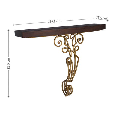 Classical console with a wrought iron base topped with wood, with annotated dimensions