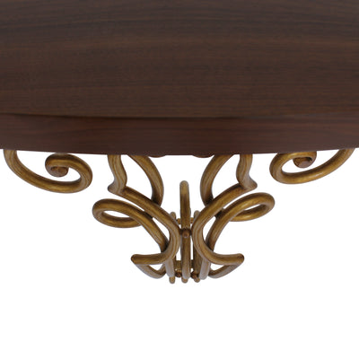 Close up of a bronze colored classical console with a wrought iron base and a dark wooden top